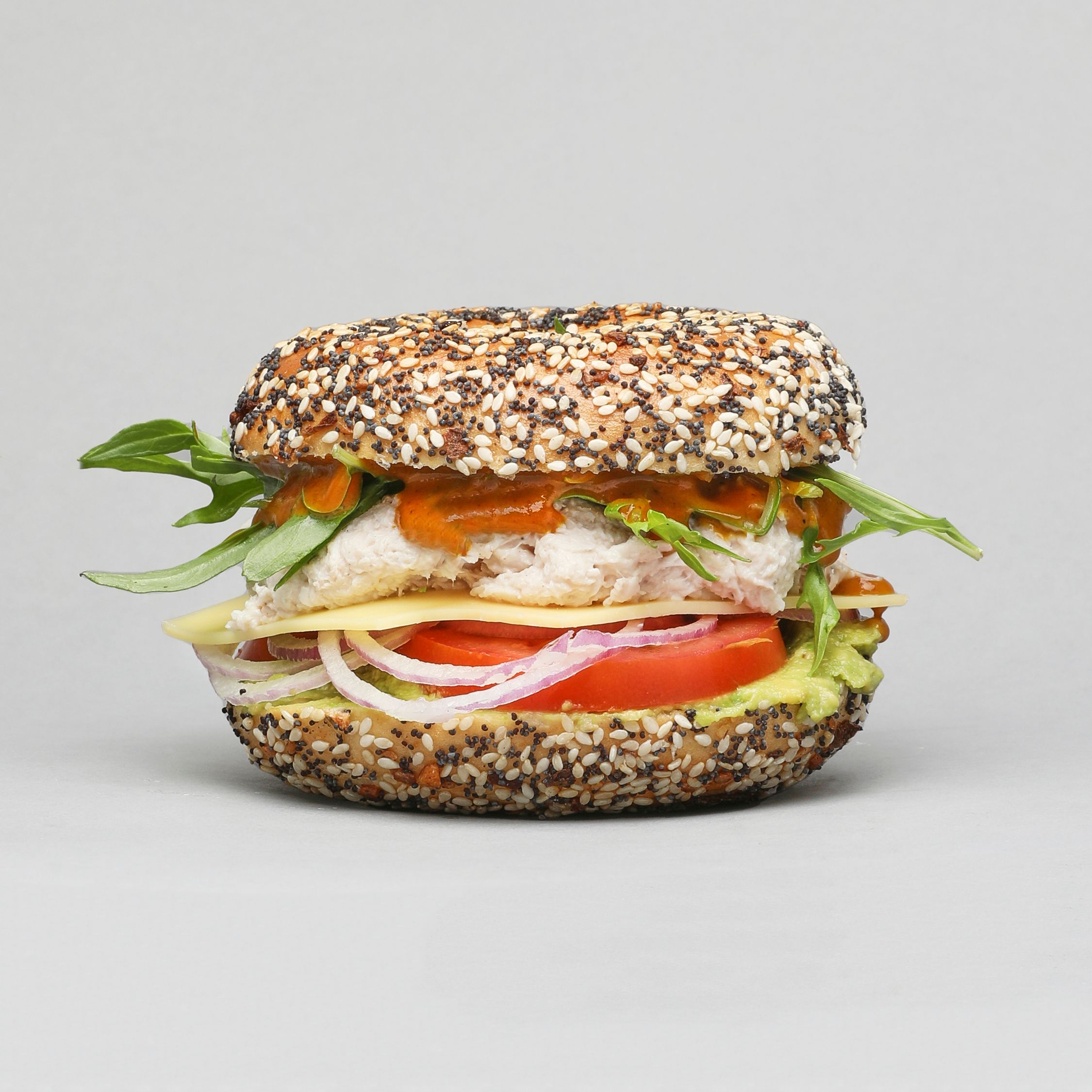 - Chicken salad, avocado, bbq sauce, tomato, onion, rocket & tasty cheese18.5